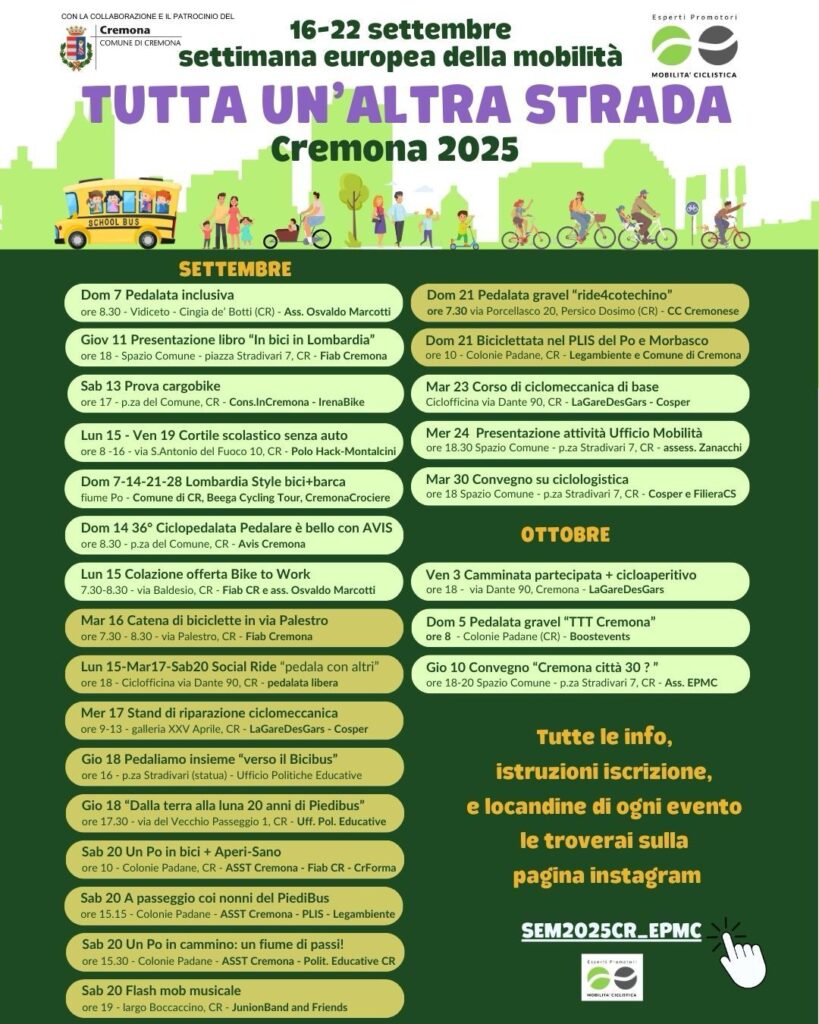 ● giovedì 9/10 dalle ore 18.00 alle ore 20.00 Spazio Comune, convegno pubblico su Cremona città 30, organizzato da EPMC, intervengono: Luca Daconto (professore associato di sociologia del territorio, università Bicocca), Filippo Bonali (ing. Ambientale-Esperto Promotore Mobilità Ciclistica);